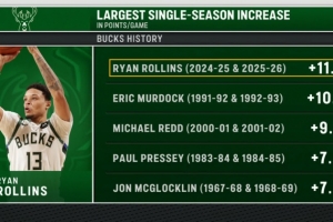 雄鹿队史单赛季场均得分涨幅榜:罗林斯+11.0第一 里德+9.2第三