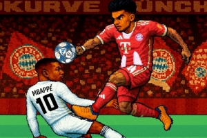 拜仁官方社交媒体发布了一张极具像素复古风格的赛前海报,海报中拜仁边锋迪亚斯与皇马前锋姆巴佩在空中激烈对抗。